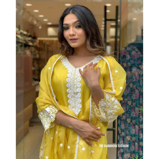 Heavy Embroidery Work Yellow Straight Kurti Pant & Dupatta