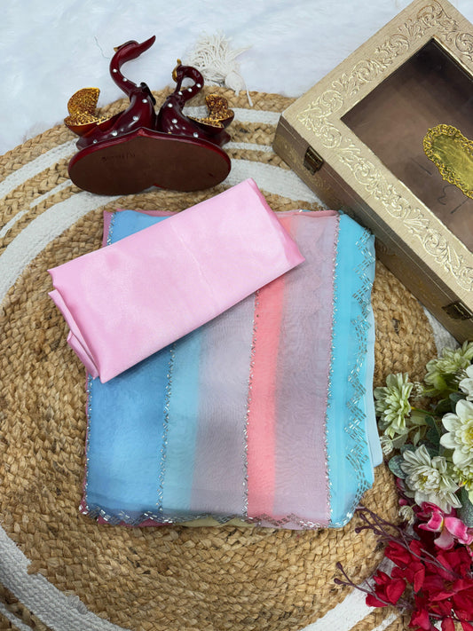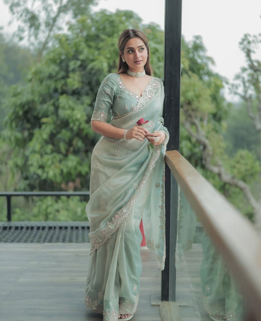 Designer Organza Saree with Sequins, Thread Lace Border and Diamond Work