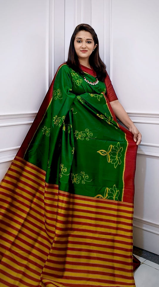 Green Muslin Saree With A Red Border & Stripes Khandua Silk Saree