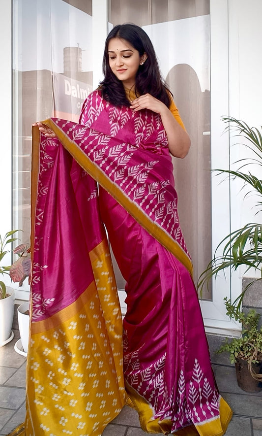 Rani Pink Body With Yellow Body Tree Design Khandua Silk Saree