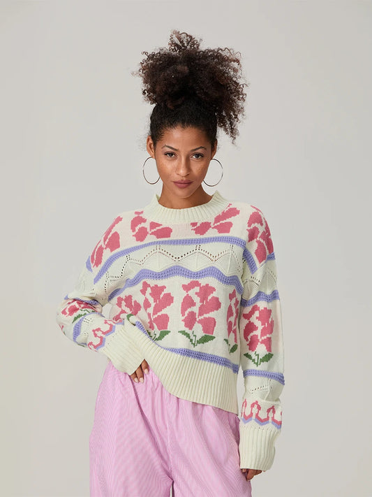 Women s Cable Knit Sweater with Ribbed Crew Neck and Floral Embroidery