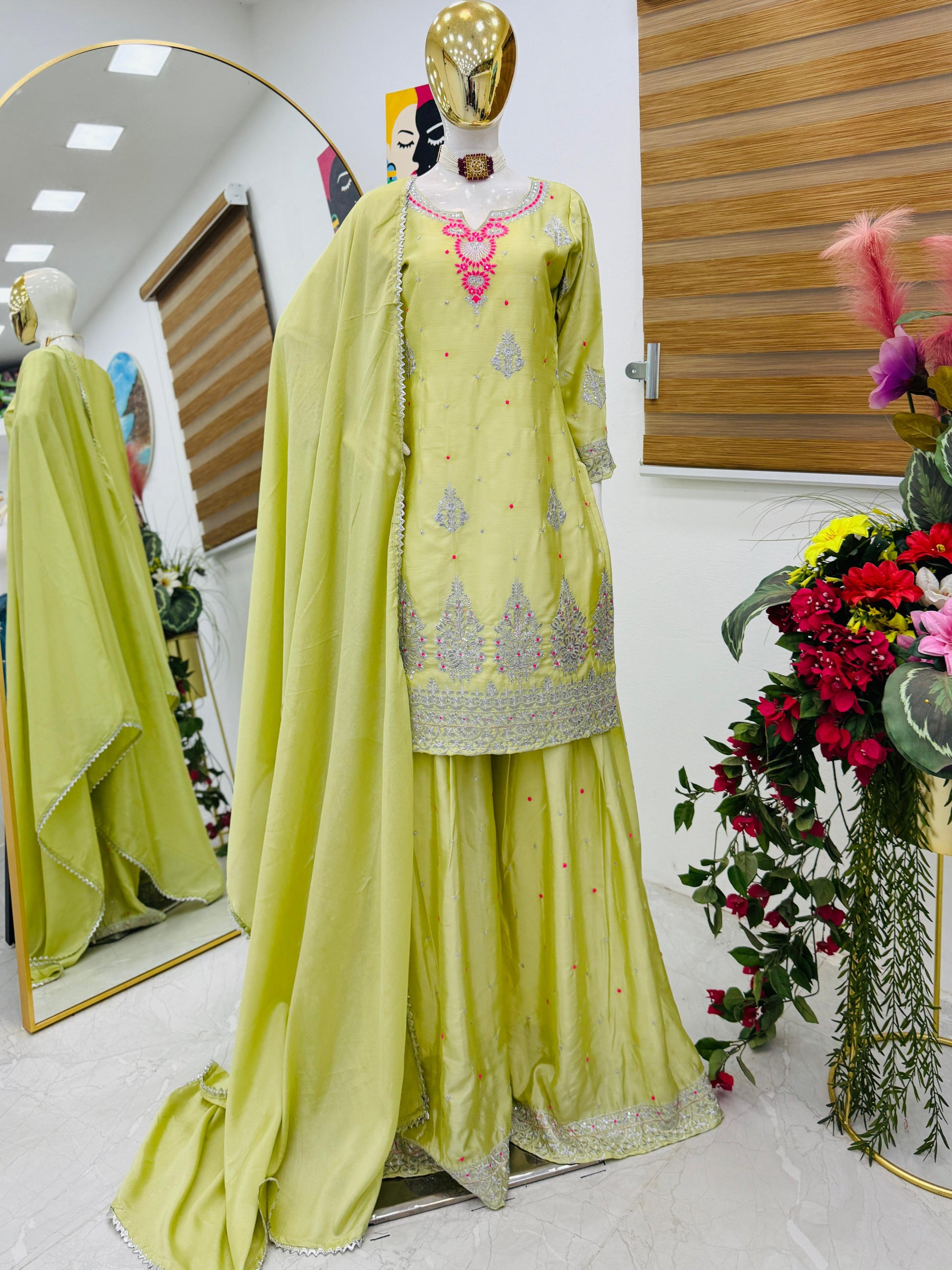 Step into timeless elegance with our Chinon Silk Palazzo Suit, beautifully crafted for the modern woman who cherishes tradition with a hint of glamour. This ensemble features:
