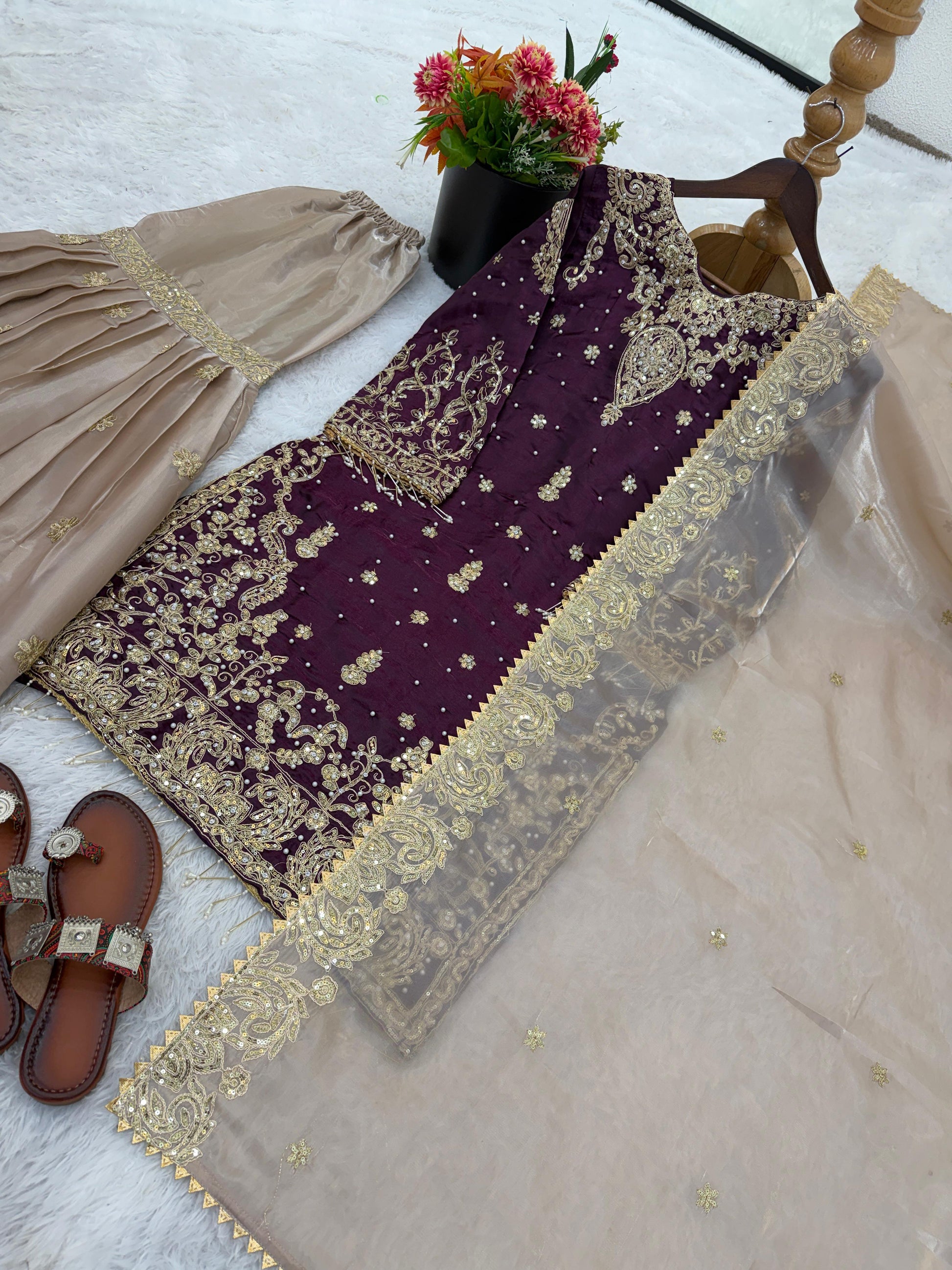 Make a regal statement with this Designer Embroidered Heavy GMY Silk Sharara Dupatta Set, crafted for women who love timeless elegance with a modern festive touch. Designed in luxurious GMY silk, this outfit beautifully blends rich texture with intricate embroidery, creating a look that feels grand yet graceful.