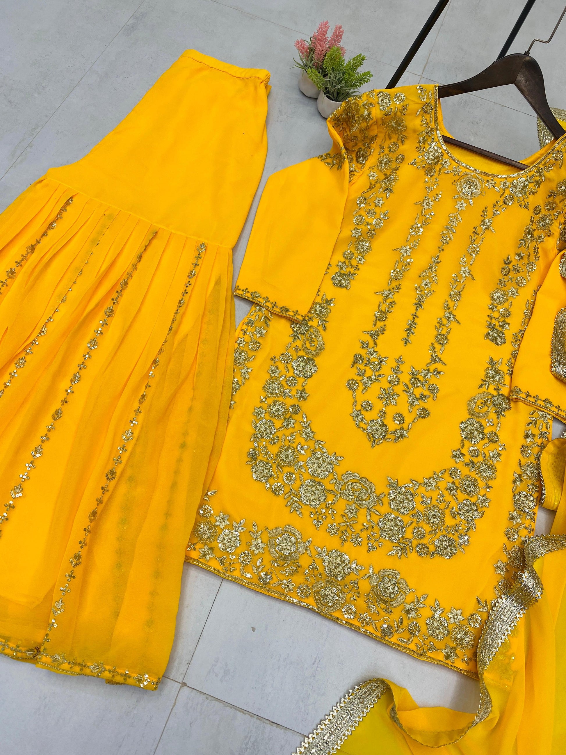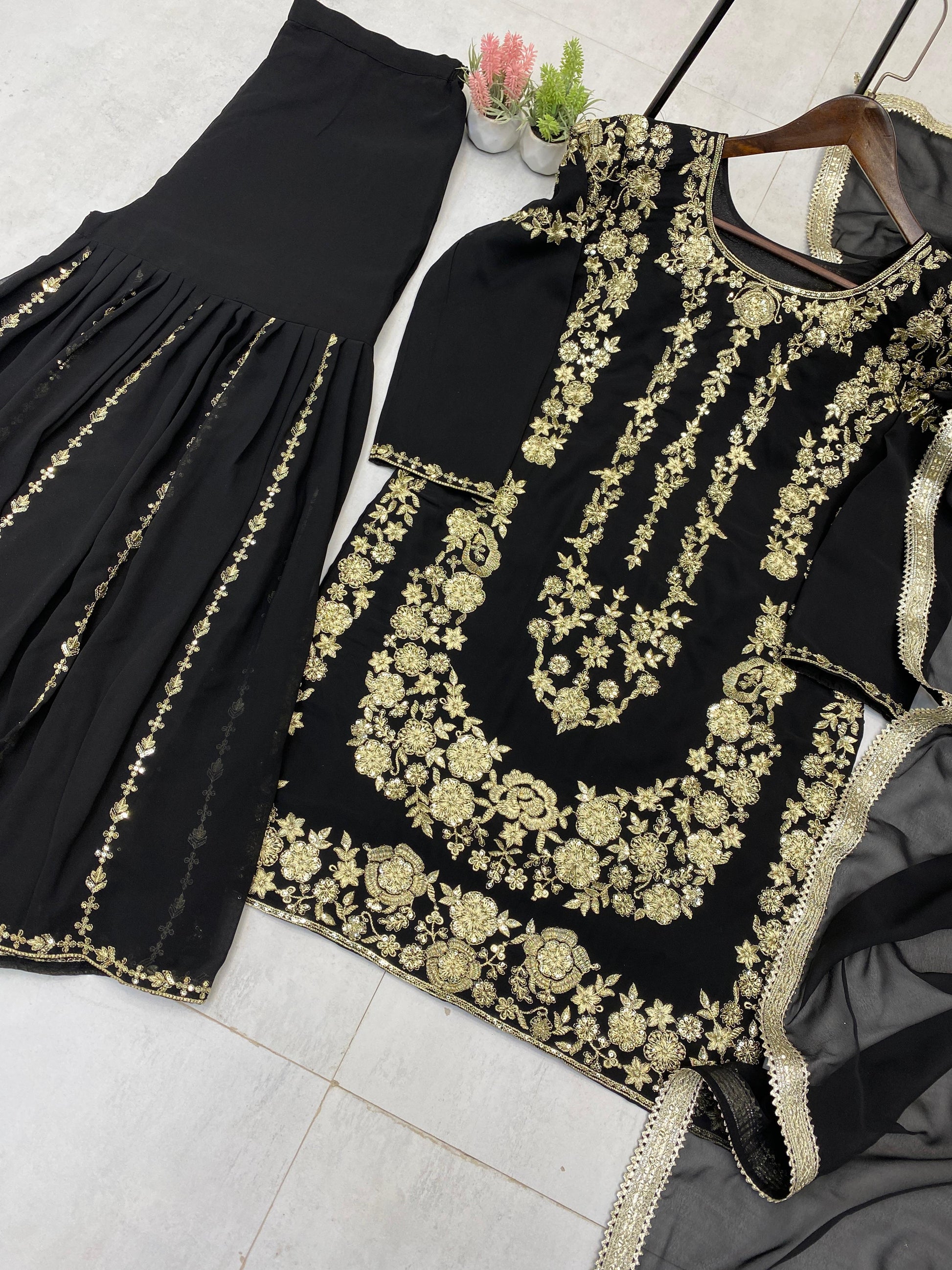 Dazzle in timeless elegance with this Designer Party Wear Sharara Suit, a stunning outfit crafted to steal the spotlight at any festive or special occasion. Meticulously designed with intricate embroidery and sequence work, this ensemble offers a perfect blend of tradition and glam.