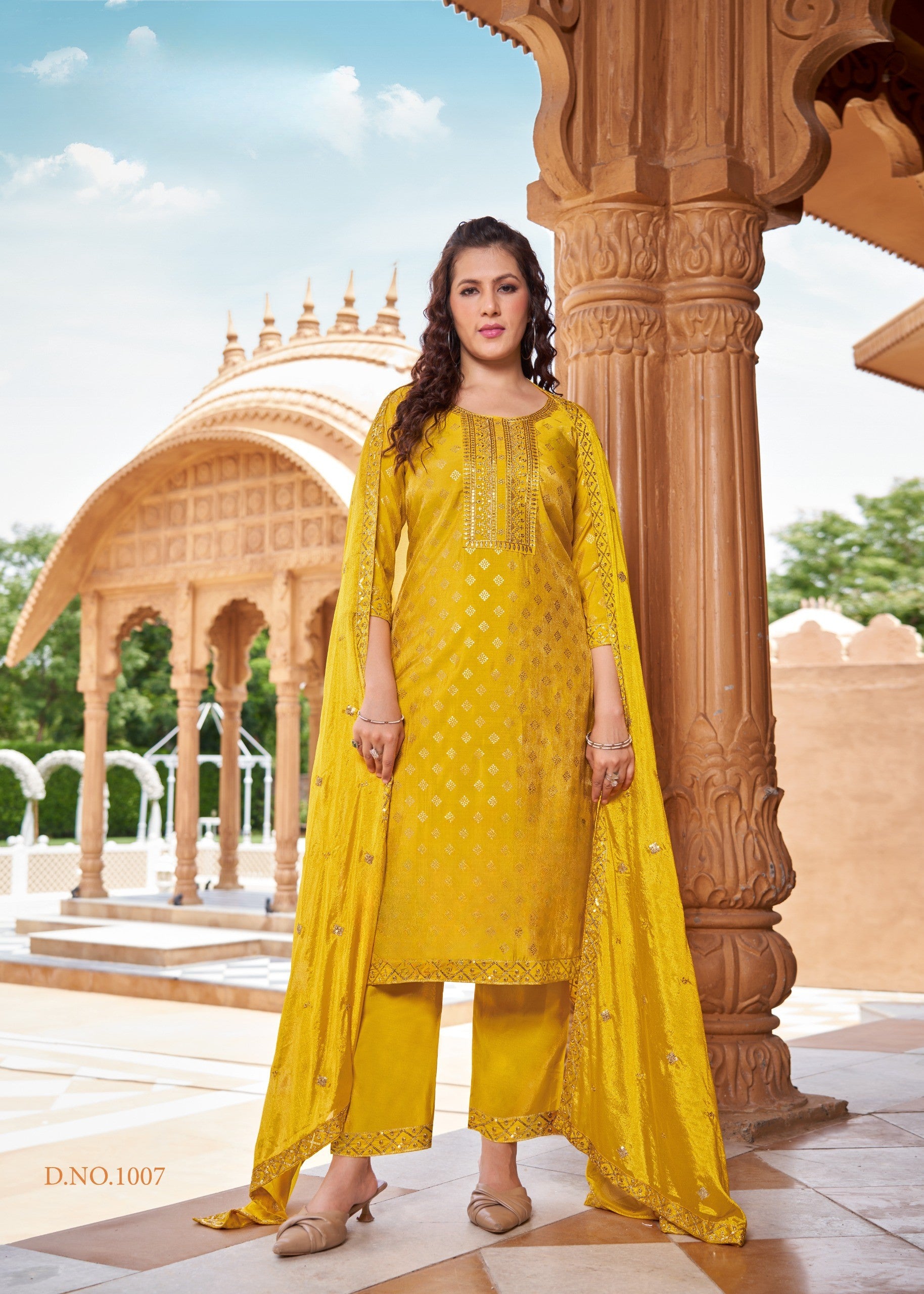 Indulge in understated glamour with this exquisite Pure Viscose Simmer Roman Embroidered Kurta Set, a perfect blend of grace and contemporary style. The kurta features intricate Roman-style embroidery that adds a royal charm to the shimmering viscose fabric. Crafted to enhance your elegance, it is paired with a coordinated pant and a gold-printed dupatta that completes the ensemble with a festive flair.