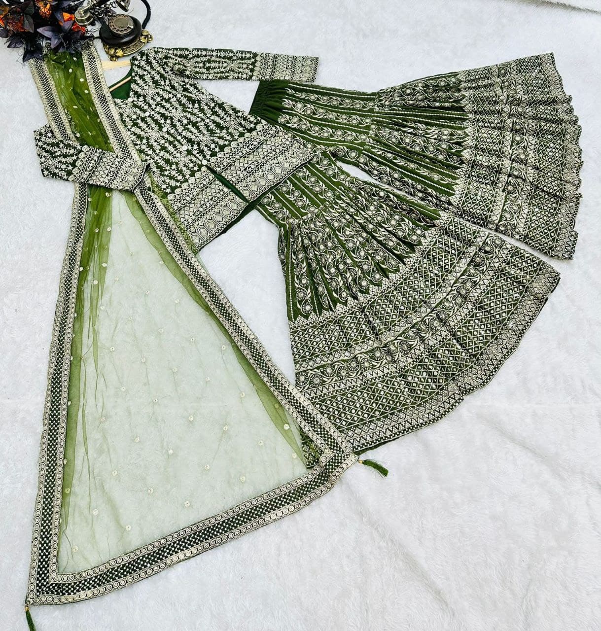 Perfect for festive occasions, parties, or wedding events, this ensemble offers a flattering silhouette with its lightweight texture and elegant drape. Paired with a matching dupatta and bottoms, it brings together comfort and couture in one beautiful outfit.