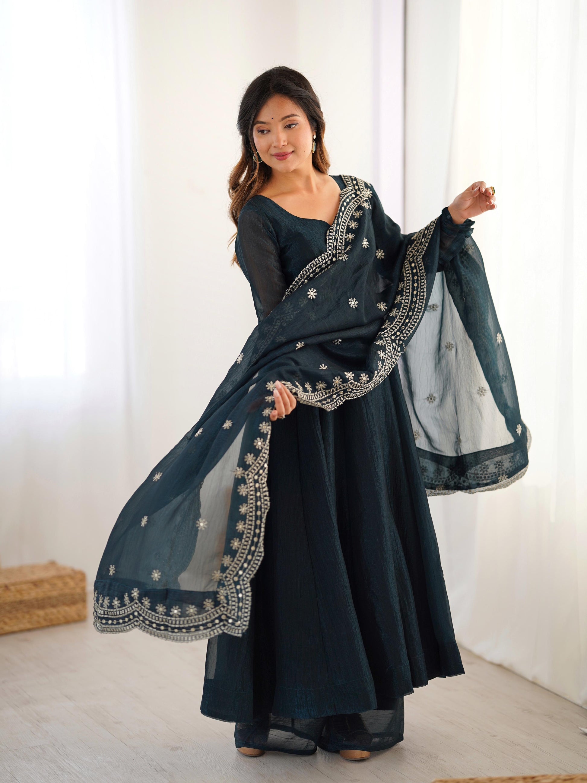 Fandy Silk Full Sleeve Gown with Embroidered Sequin Work Dupatta