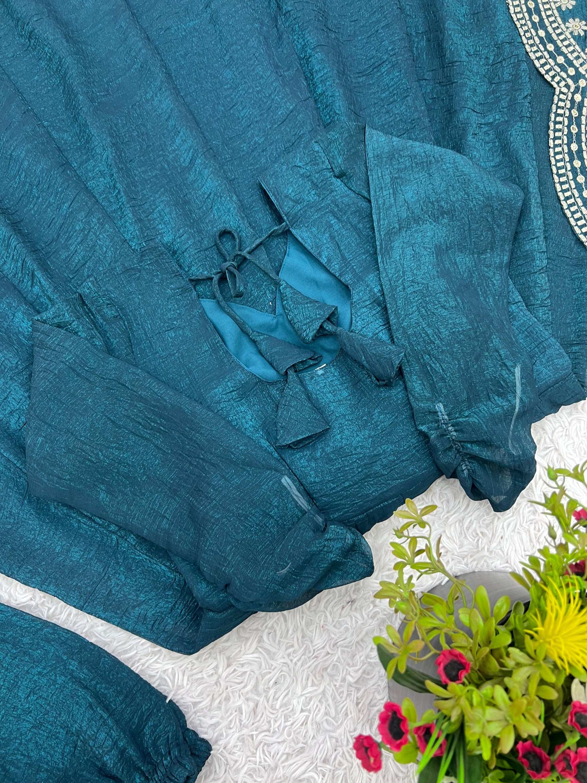 Elevate your festive and party wardrobe with this luxurious Fandy Silk Full Sleeve Gown, a masterpiece of elegance and comfort. Crafted from rich, flowy Fandy silk, this gown features full sleeves and a flattering silhouette that gracefully drapes the body. The gown is paired with a gorgeous embroidered dupatta adorned with delicate sequin work, adding a touch of shimmer and glamour to your ensemble.