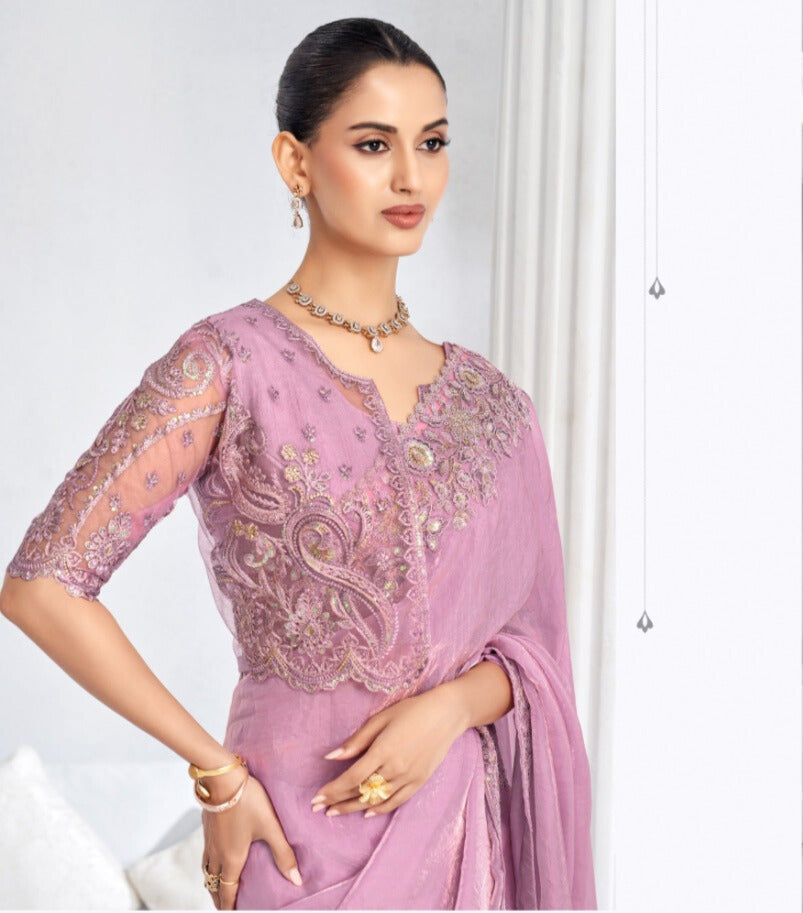 Step into spotlight-ready elegance with this stunning Heavy Embroidered Lace Border Saree with Sequins — a perfect blend of glamour and tradition. The saree features a richly woven fabric (choose soft organza / georgette / tissue as per your stock) that gracefully drapes and flows, enhanced by intricate embroidery, shimmering sequin work and a luxurious lace‑border that frames the silhouette.