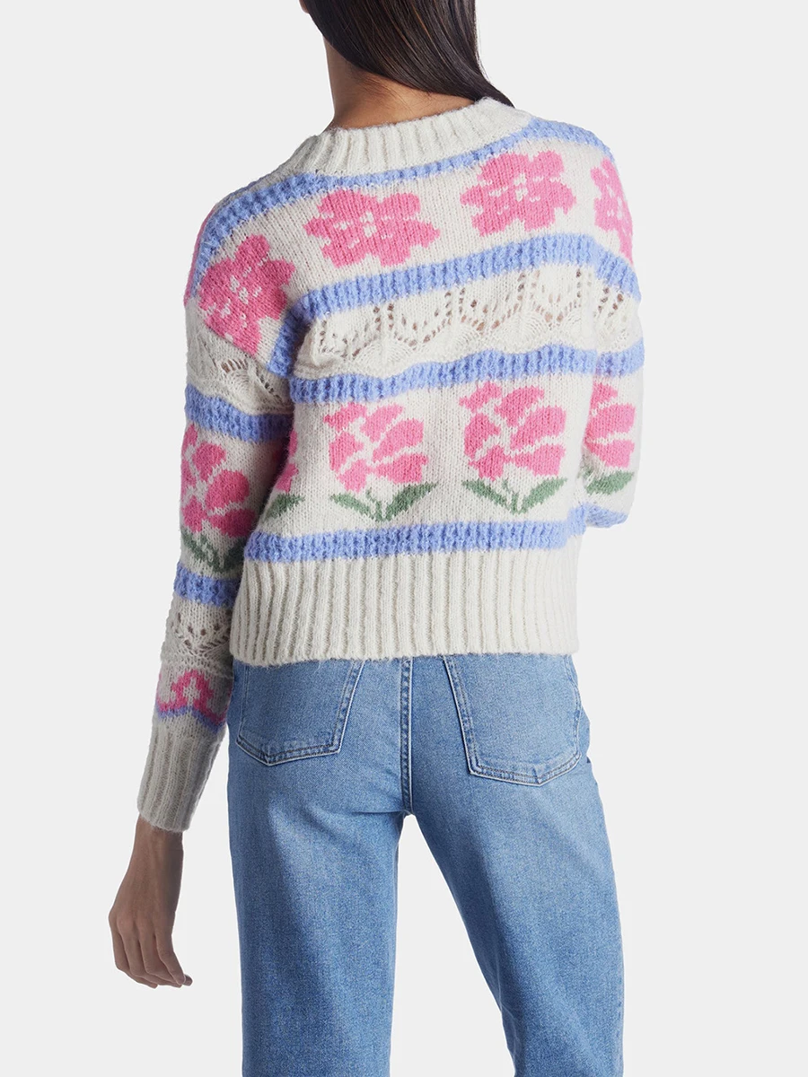 Women s Cable Knit Sweater with Ribbed Crew Neck and Floral Embroidery