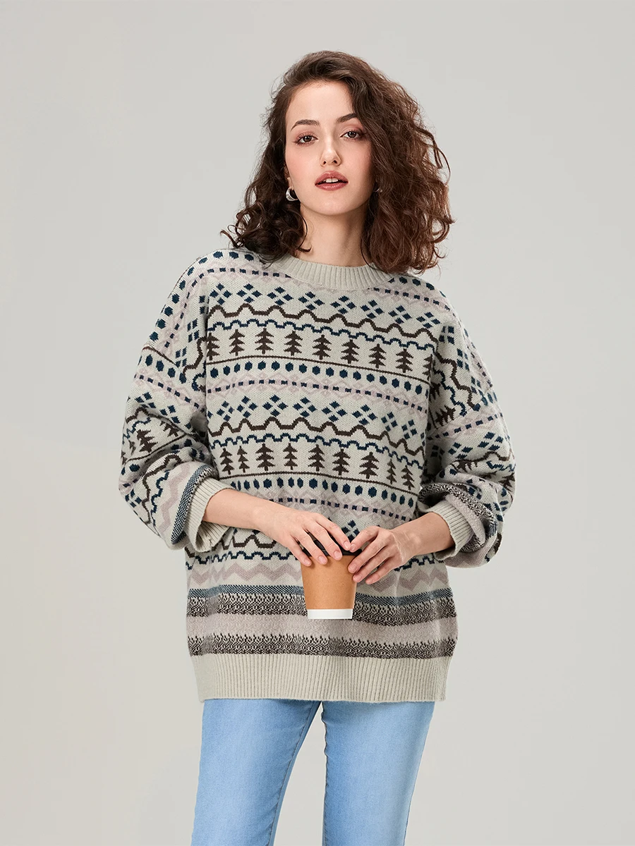Women s Festive Reindeer Print Crew Neck Long Sleeve Knit Sweater