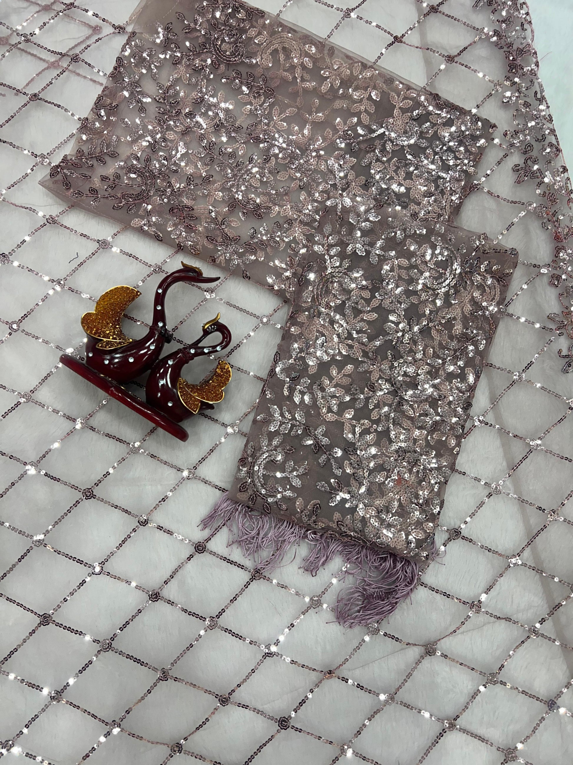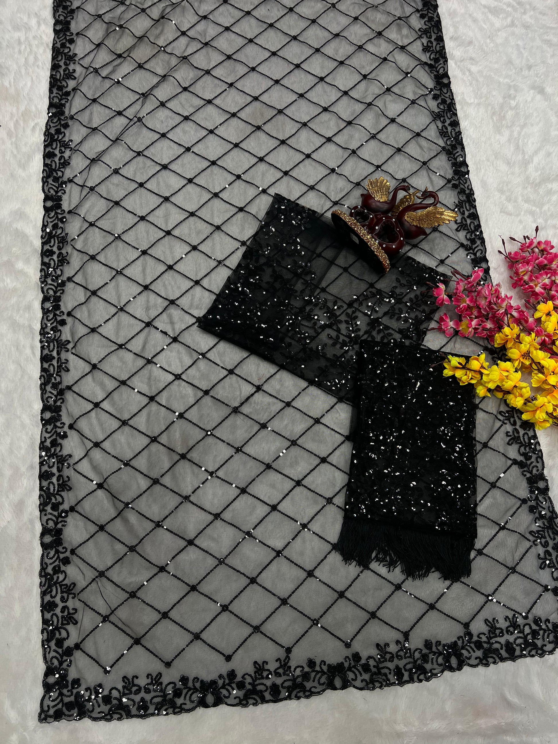 Drape yourself in effortless glamour with this Women's Sequin Embroidered Soft Net Saree, designed to bring out your most graceful self. Crafted from ultra-light soft net, this saree flows like a dream and features intricate sequin embroidery that catches the light with every move.