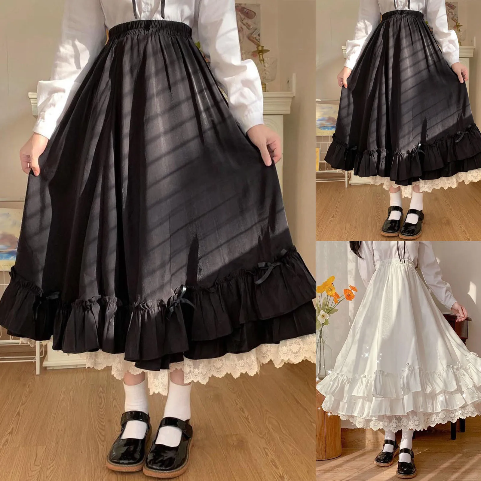 Women's Solid Color High Waist Two Piece Skirt Set Japanese Style Sweet Lolita Ruffled Hem Cute Long Skirts